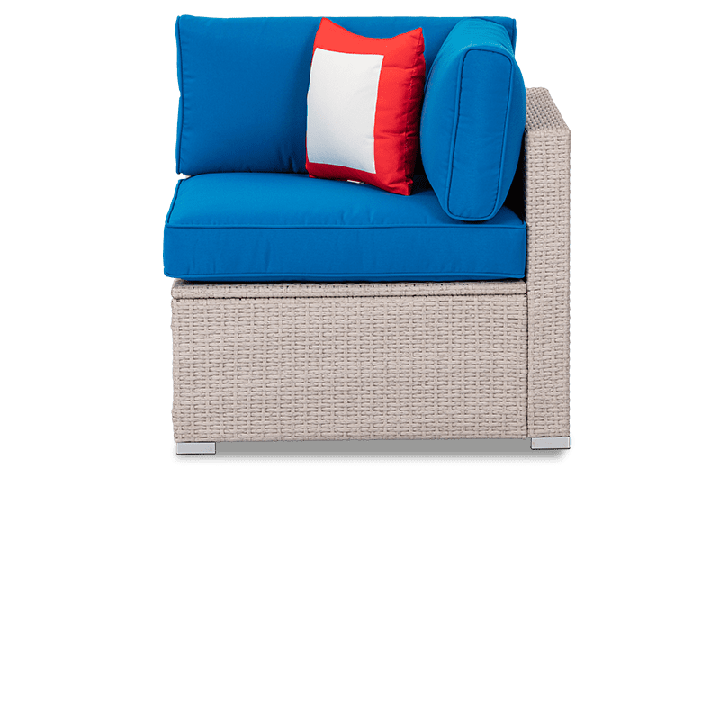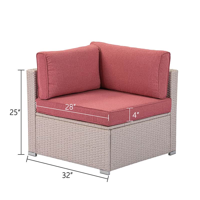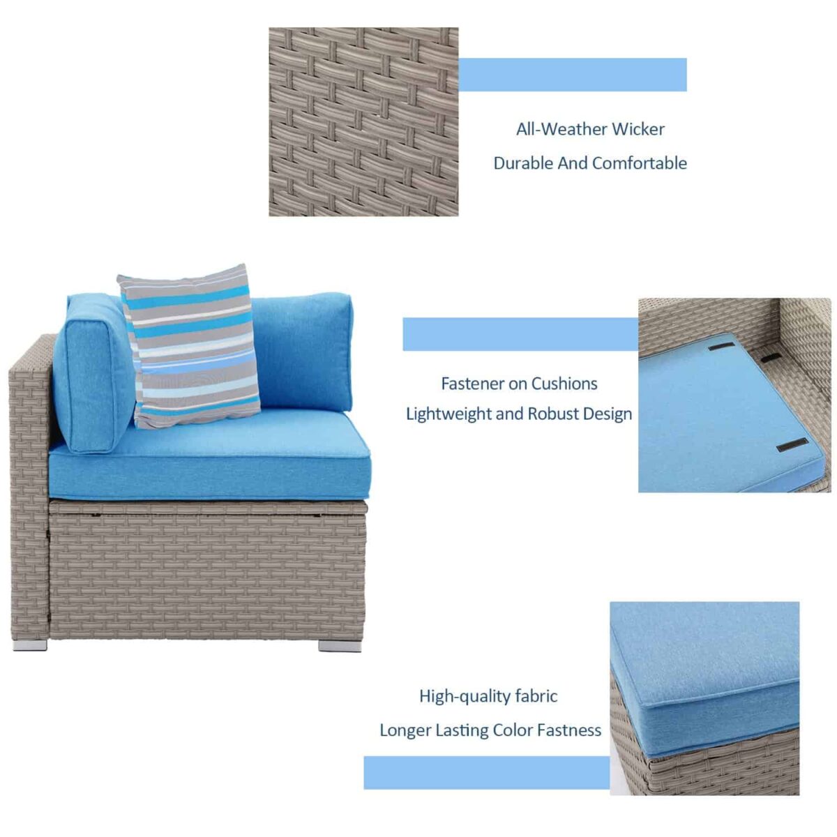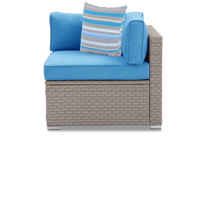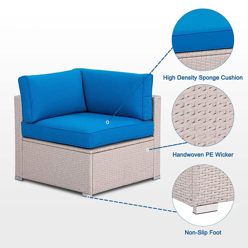 Right corner patio sectional sofa has sturdy rust-resistant steal frame with weather-resistant high-quality material designing for outdoor livings. The powder-coated steel frame is a solid foundation for the hand-woven PE resin synthetic wicker to fold around. Patio sectional cushion’s shape against any deformity, yet feels so comfortable and relaxing to sit on and lean back. The solution-dyed fabric holds a strong, vibrant blue color that won’t fade. All-weather elements allow the chair to live in the garden or on the patio looks pretty. You can combine with other counterpart sectionals to assemble a sofa set in any shape you want.