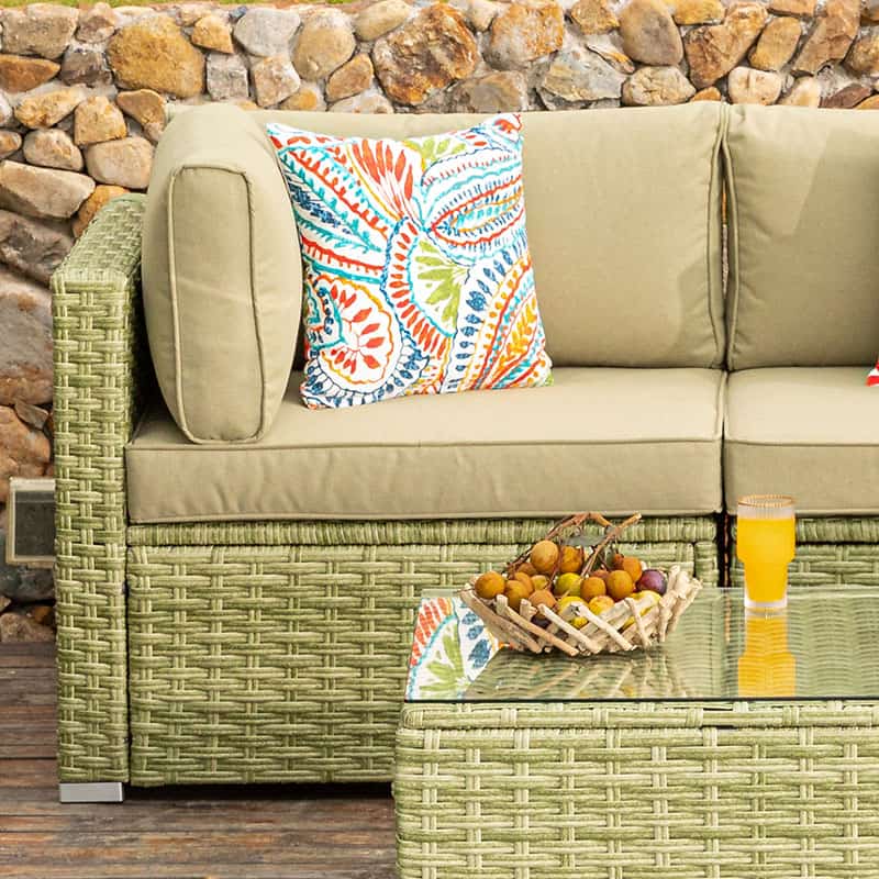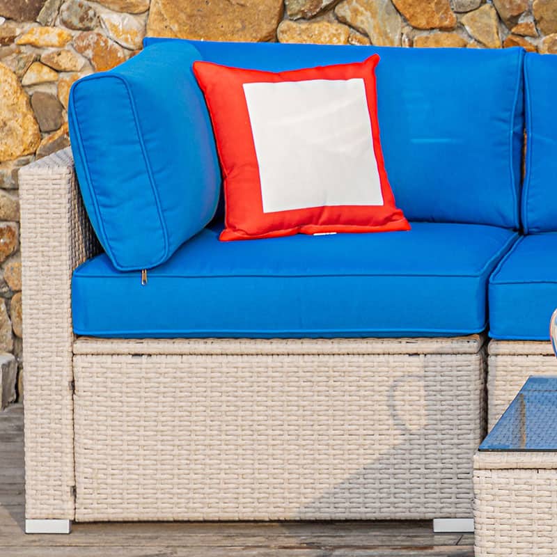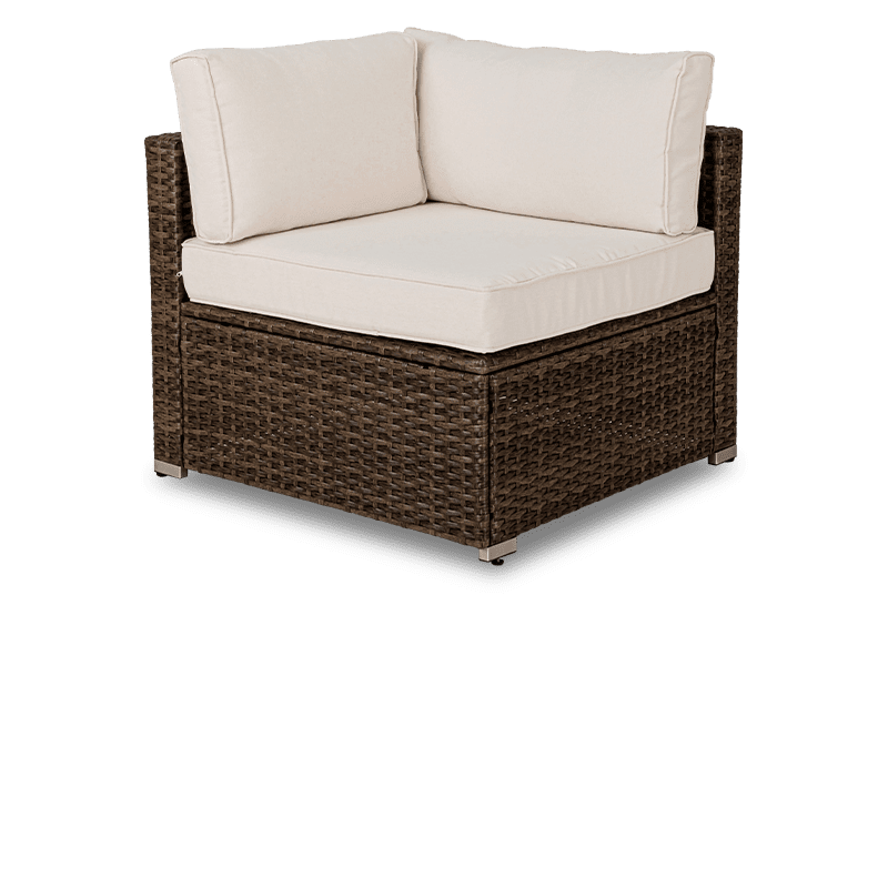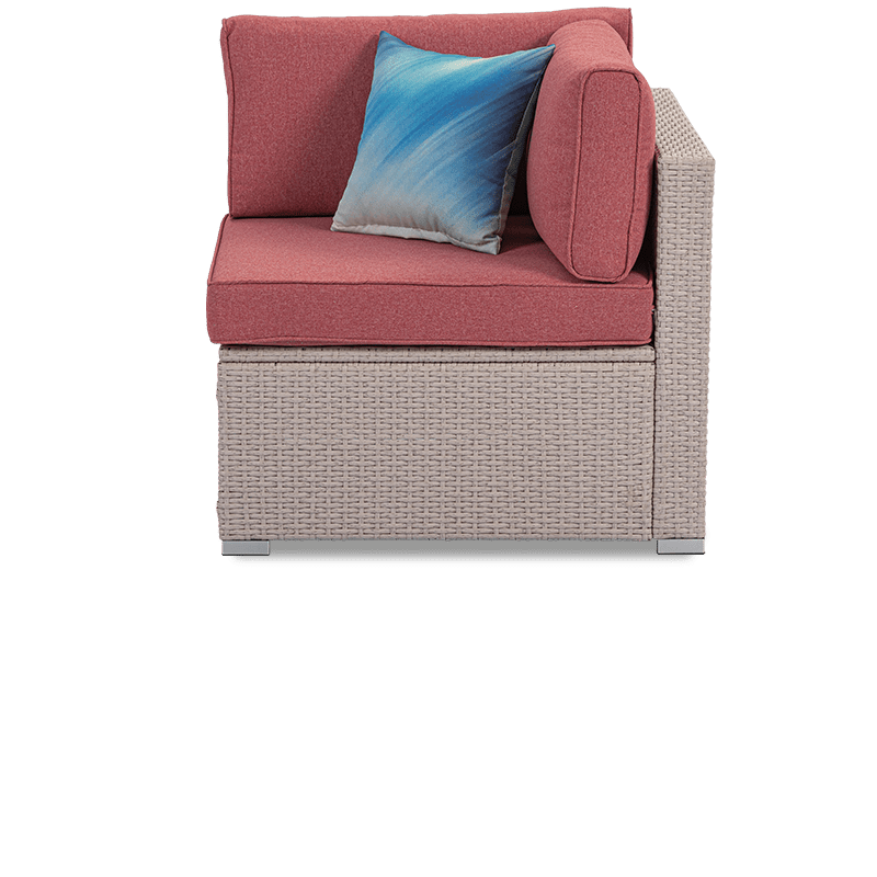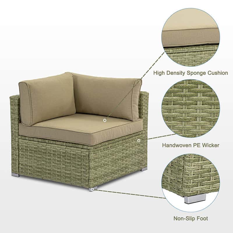 Right corner patio sectional sofa has sturdy rust-resistant steal frame with weather-resistant high-quality material designing for outdoor livings. The powder-coated steel frame is a solid foundation for the hand-woven PE resin synthetic wicker to fold around. Patio sectional cushion’s shape against any deformity, yet feels so comfortable and relaxing to sit on and lean back. The solution-dyed fabric holds a strong, vibrant blue color that won’t fade. All-weather elements allow the chair to live in the garden or on the patio looks pretty. You can combine with other counterpart sectionals to assemble a sofa set in any shape you want.