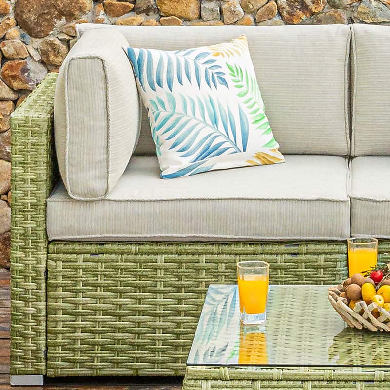 The armless outdoor sofas are produced from sturdy rust-resistant powder-coated steal and hand-woven in mild gray weather-resistant PE resin wicker. All cushions are included