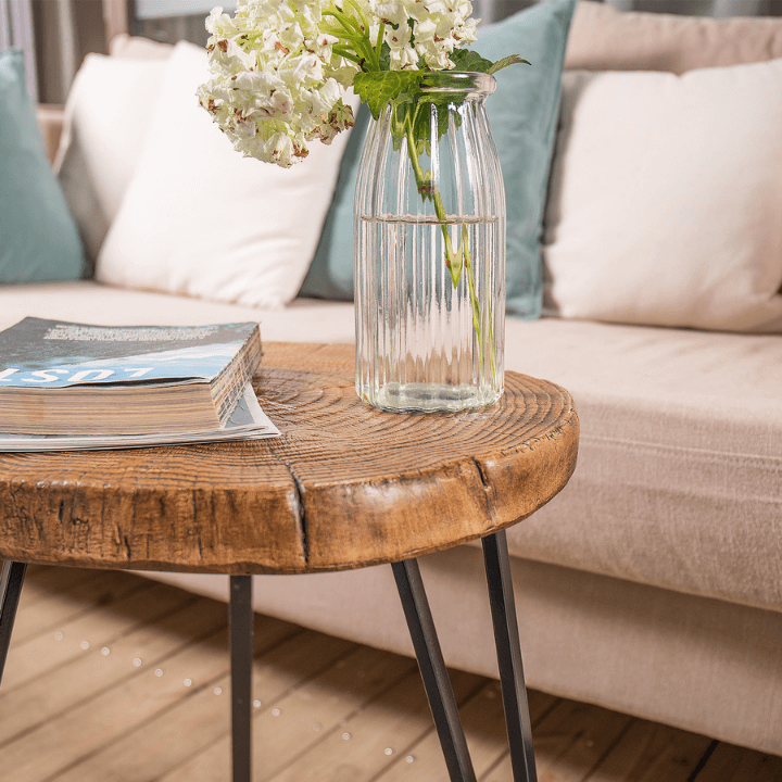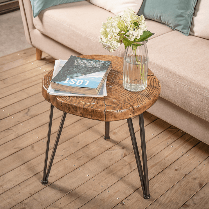 The replica wood end table is constructed carefully with selected material with hand-painted faux wood finish gives your home or deck an earthy flair. But it’s all a beautiful illusion right down to the textured age rings and wood-like edge. Supported by 3 heavy duty hairpin legs in matte black, the structure is solid and stable. The top surface is all-weather resistant material Megnesium Oxide, easier to care and clean than real wood. Each side table slab is hand-made and carved by skilled craftsmen to revivify its natural imperfections, so none is exactly alike in wood grain patterns, shape, and color. Each accent table undergoes a multi-step complicated process such as polishing, painting, and waxing. Every step of the production process needs to be very carefully, making this unique table is a timeless living accessory for your home.
