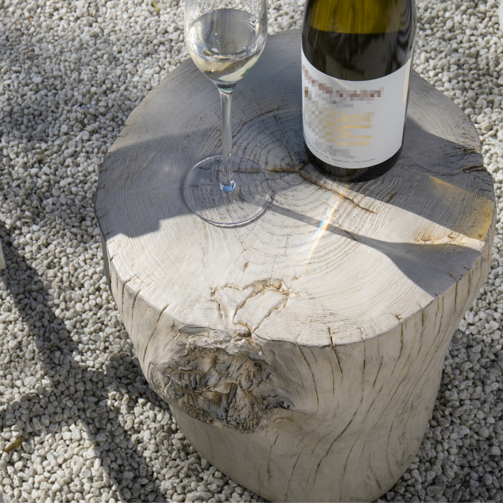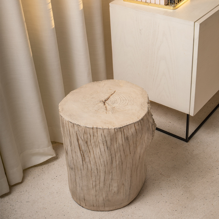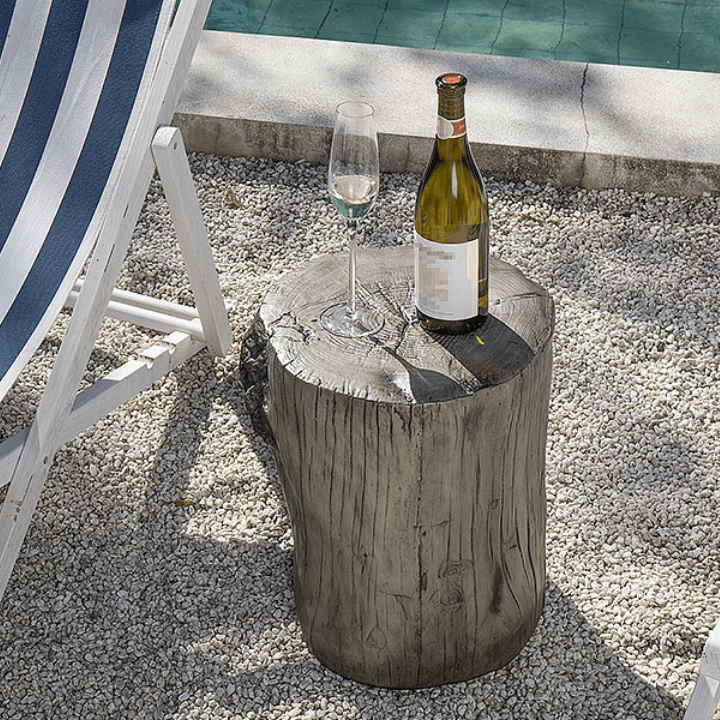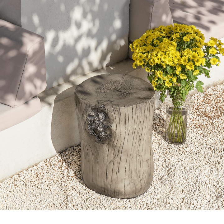 This end table puts the deep cracks and hand-pained knotty grain of natural wood on full display on a outer sphere of cylinder base of Magnesia oxide, bringing a natural feel to where it stands. This weather-resistant table is the perfect addition to your outdoor seating area, giving you a spot to rest drinks and snacks while relaxing outdoors. This end table also can be used as a stool in a pinch. This round stump side table harmonious with the surrounding environments. For a circular assortment that’s full of organic color and texture, to partner our outdoor wicker furniture will be a good choice. Each table will exhibit its own unique markings so each piece may have subtle differences.