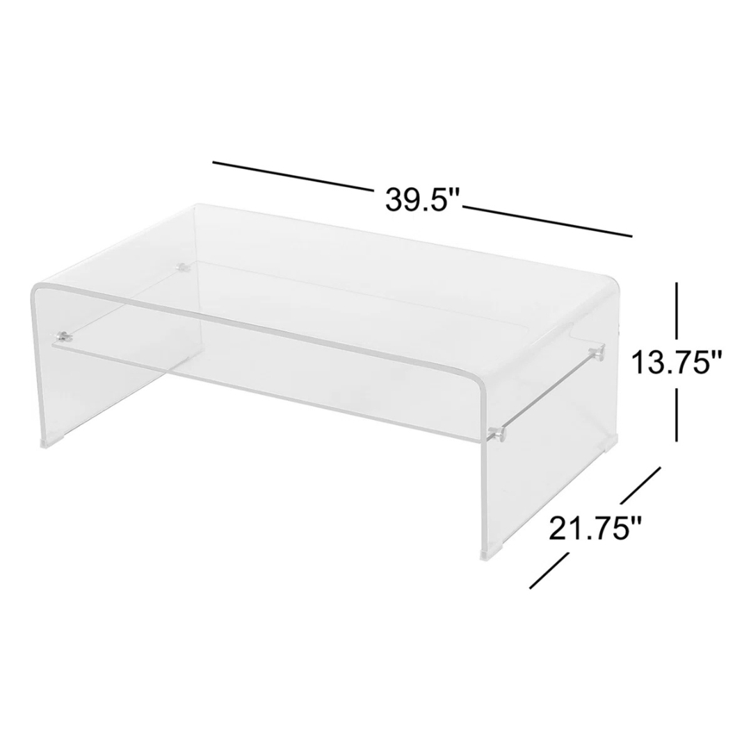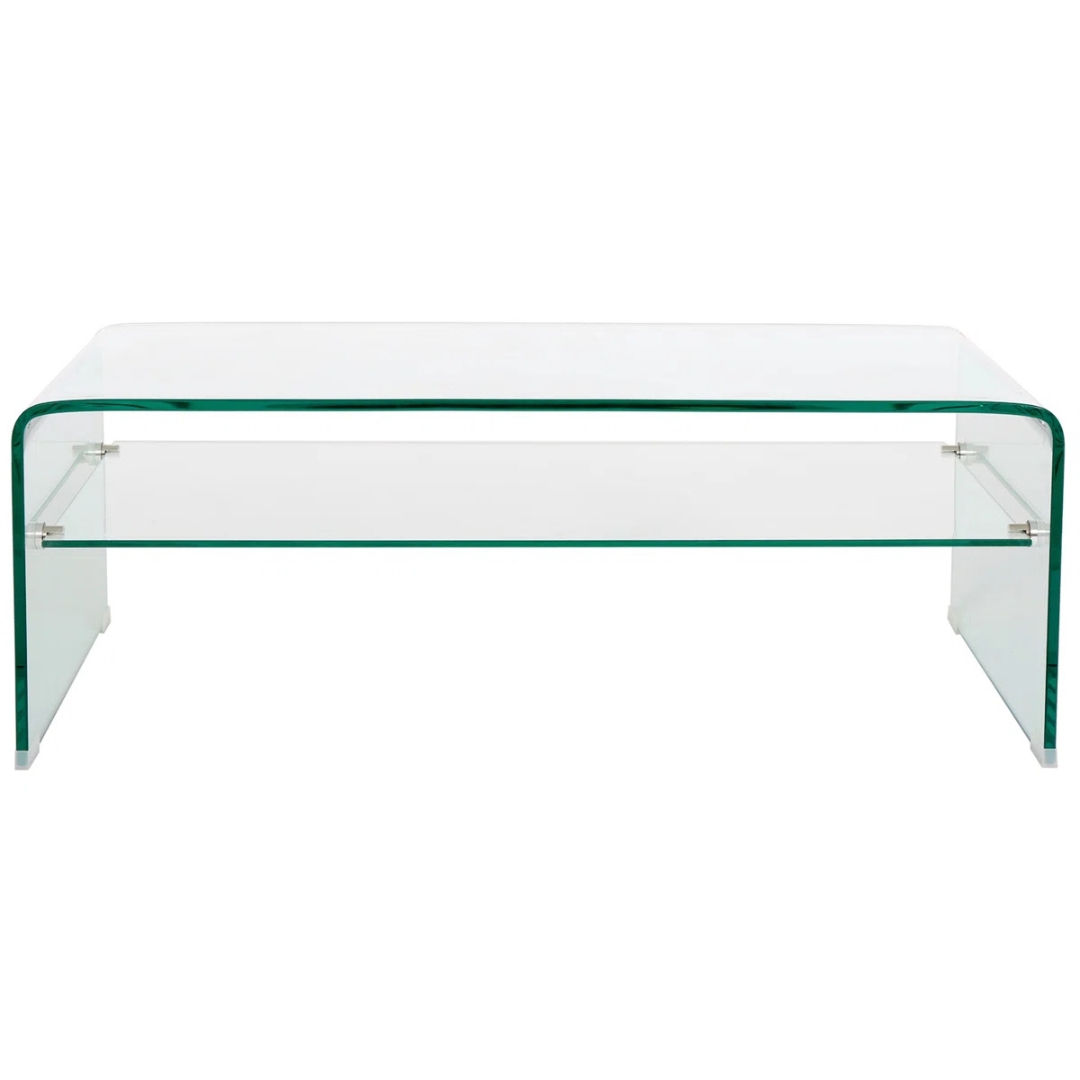 An integrated lower shelf provides convenient space to organize and display books, magazines, or décor without cluttering the top surface. The clean lines and green-tinted glass create a striking optical effect that adds sophistication to any modern living room. Measuring 13.75″ high by 39.5″ wide, this coffee table balances subtle curves with durability, supporting up to 50 lbs. The 8mm tempered glass ensures strength and longevity while maintaining a sleek look.